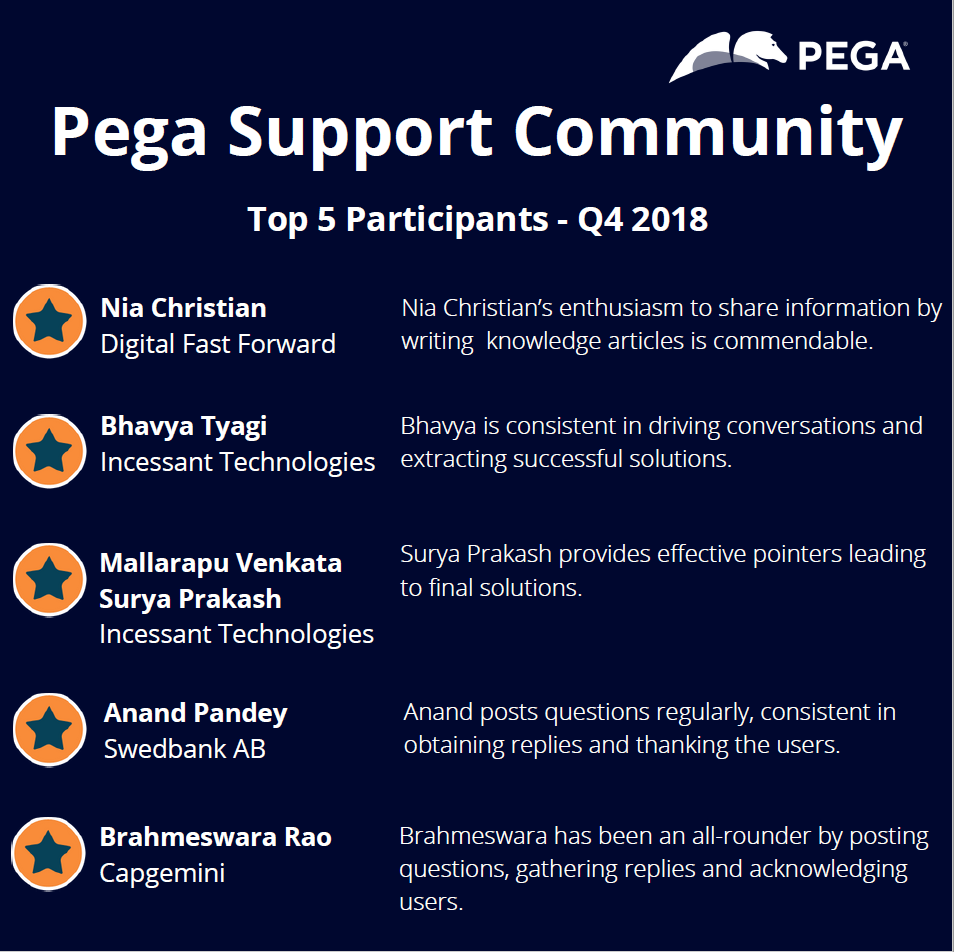 The PSC Top 5 Participants program aims to recognize quality participation on our community and is exclusively designed for non-Pega employees!!